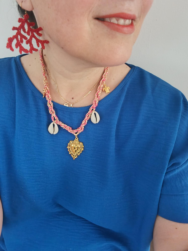 Collier réalisé au crochet avec deux cordons en coton rose et doré.
