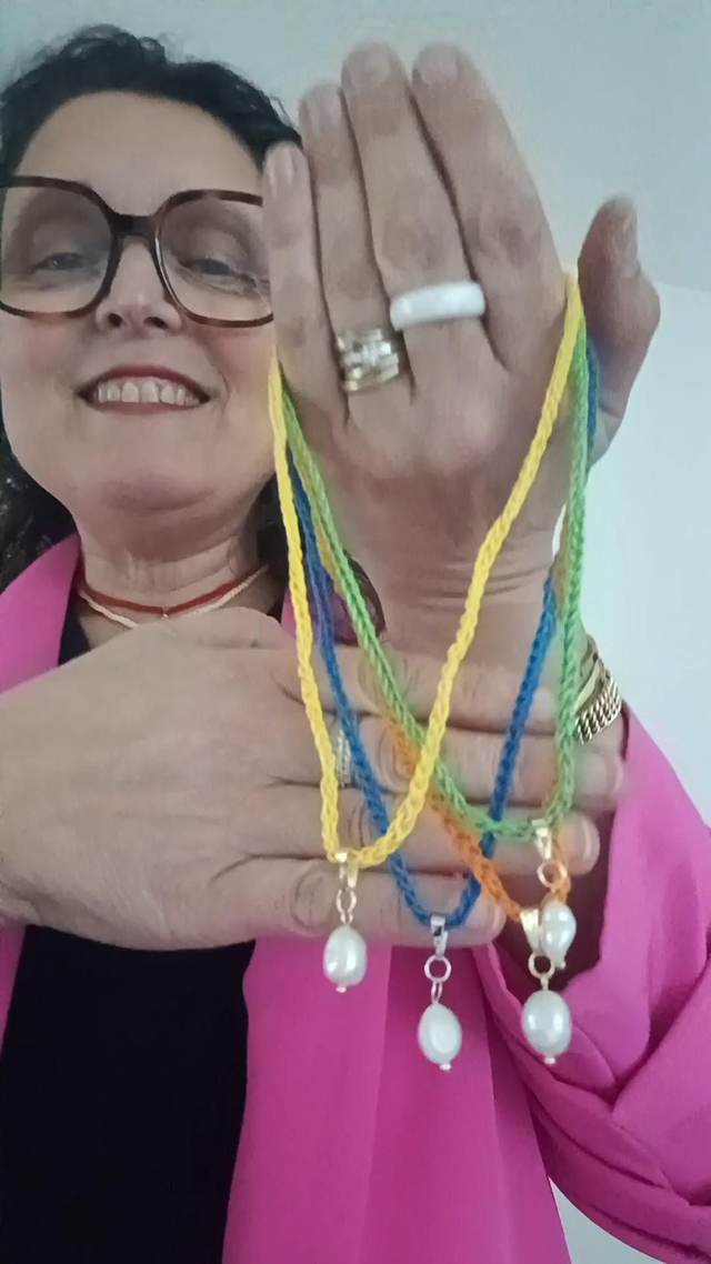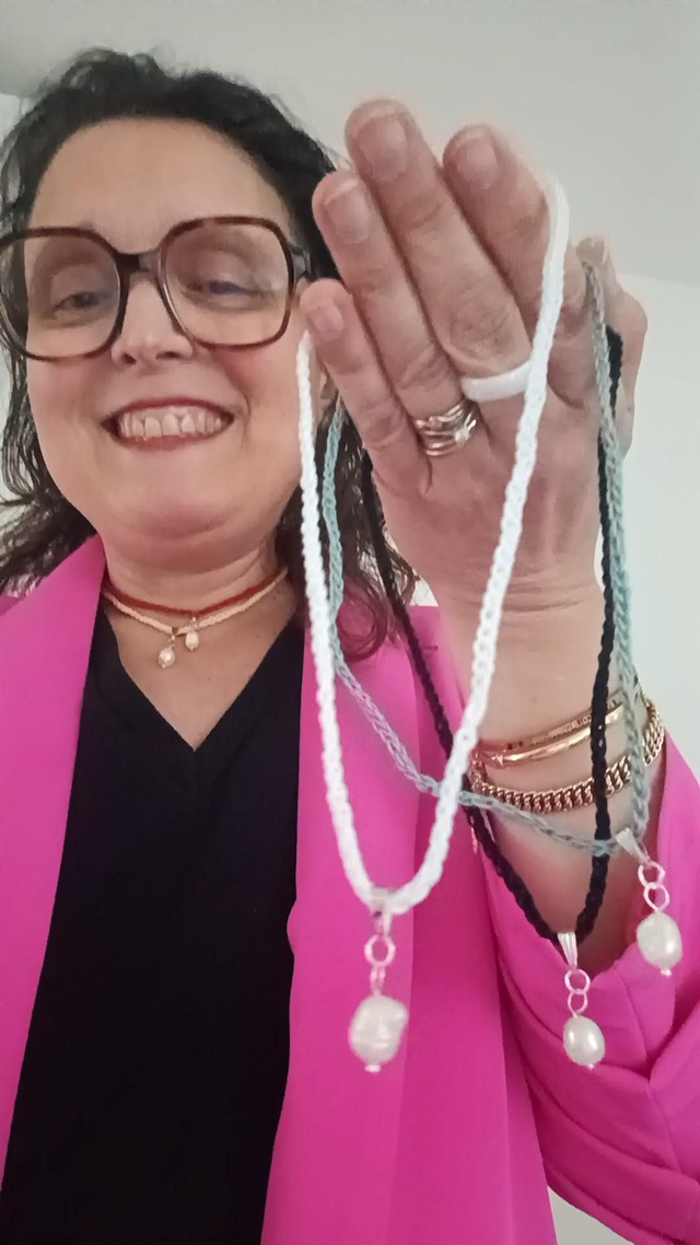 Collier en coton fait main au crochet avec une véritable perle de culture.