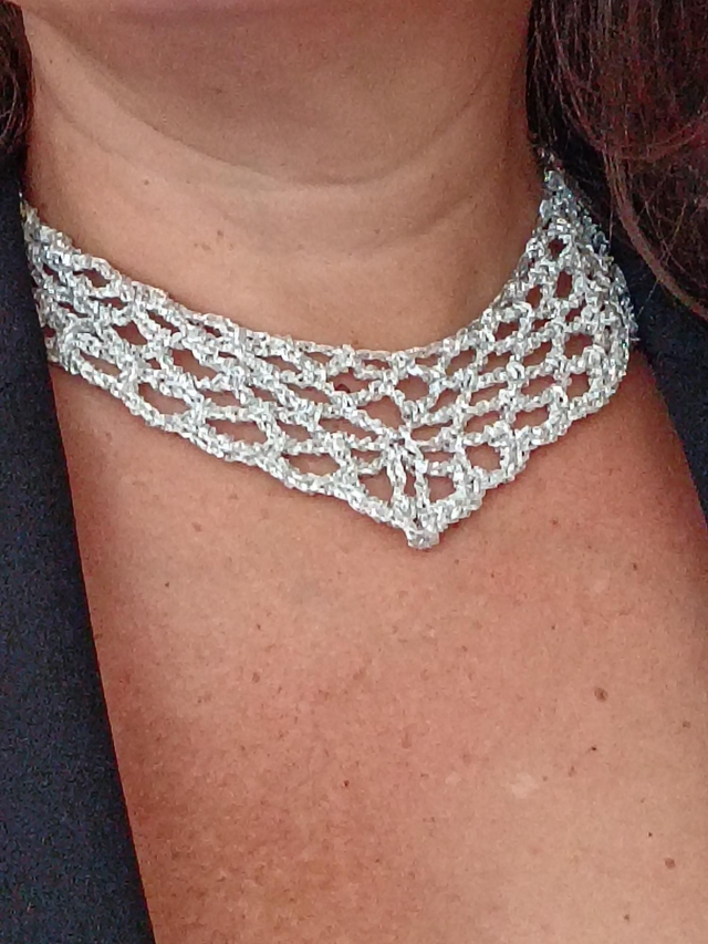 Collier plastron argenté réalisé entièrement en coton à la main au crochet. Il s'attache par un lien.
